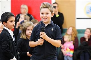 This week, Grade 1 students put their heads together to come up with the best ways to make new friends, and shared their ideas with the Junior School at Friday Morning Live. The project was inspired by Jean Bigelow, who recently read a story in assembly titled: We Don’t Eat Our Classmates, about a young T-Rex who wants to make friends, but has some trouble. ”Mr. Bowers responded that he was looking for some new friends,” says Ms. Graham, “so we decided that we would take action and give Mr. Bowers some tips.” Each student wrote and illustrated their own idea for how to make a friend, then read them aloud during this Friday’s assembly. Some of the examples included sharing, talking to new students, and helping others when they fall down. They wrapped up the presentation with a song about friendship. The project showcased the excellent thoughtfulness, caring, and risk-taking that Junior School students practise every day at GNS. Great work Grade 1s!